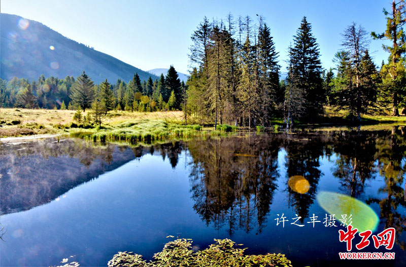 中国西部最北端有一片自然景观,这里就是喀纳斯风景区,位于新疆阿尔泰山中段,地处中国与哈萨克斯坦、俄罗斯、蒙古国接壤地带。喀纳斯湖景区由高山、河流、森林、湖泊、草原等构成的自然景观。这里雪峰耸峙绿坡墨林,湖光山色美不胜收。图为2019年8月8日的新疆喀纳斯风光。工人日报-中工网许之丰摄影报道