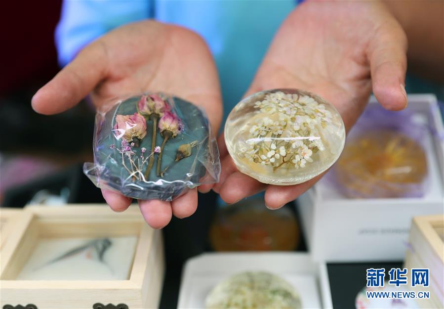 8月16日,工作人员在豫园中心广场的云南特产市集上展示用鲜花和干花制作的精油皂(右)和香薰蜡片。 当日,2019“春城花都 好享昆明——云南昆明文化和旅游宣传推广系列活动”在上海豫园商城开幕。 新华社记者 刘颖 摄