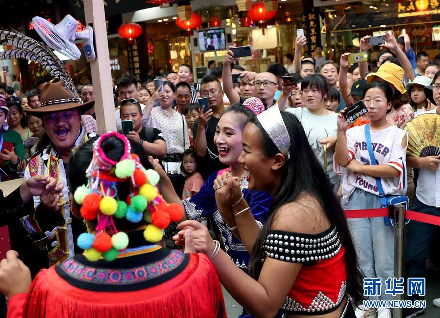 8月16日,在豫园中心广场,来自云南的歌舞演员载歌载舞,吸引众多游客驻足欣赏。 当日,2019“春城花都 好享昆明——云南昆明文化和旅游宣传推广系列活动”在上海豫园商城开幕。 新华社记者 刘颖 摄
