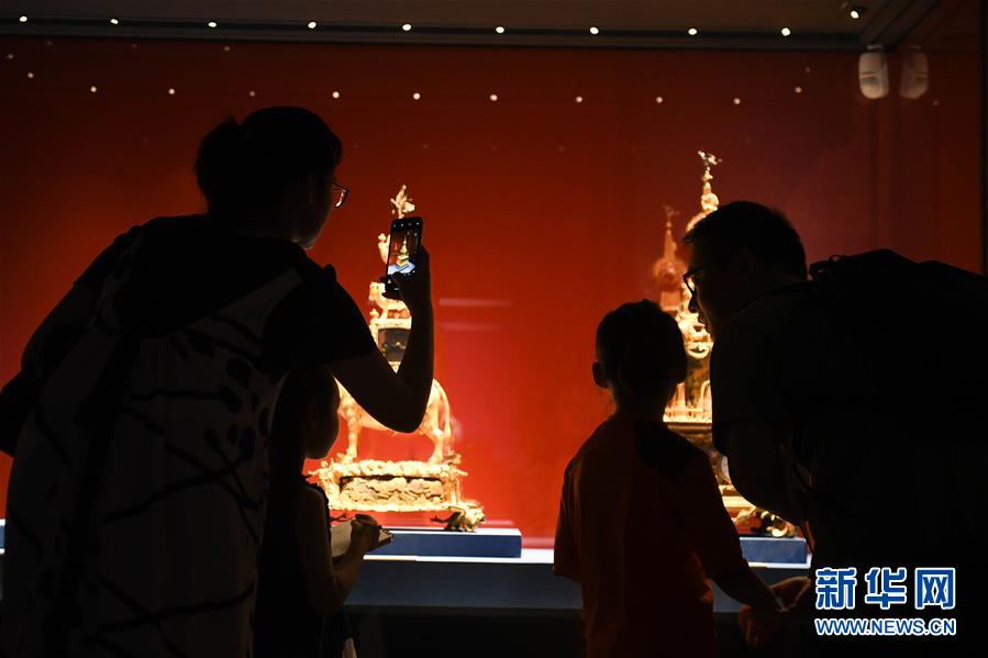 8月16日晚,在安徽博物院新馆内,观众参观“故宫养心殿文物精品展”。 为进一步丰富公众夜间文化生活,7月24日至8月30日期间的每个周五,位于安徽省合肥市的安徽博物院新馆开展夜间延时服务,参观时间延长至夜间21时。 新华社记者 张端 摄