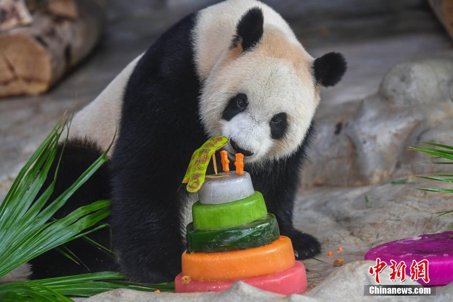 8月18日,海南热带野生动植物园的大熊猫兄弟“贡贡”和“舜舜”迎来了6周岁生日,这是它们在海南度过的第一个生日。图为大熊猫“贡贡”吃特制的冰“生日蛋糕”庆生。中新社记者 骆云飞 摄