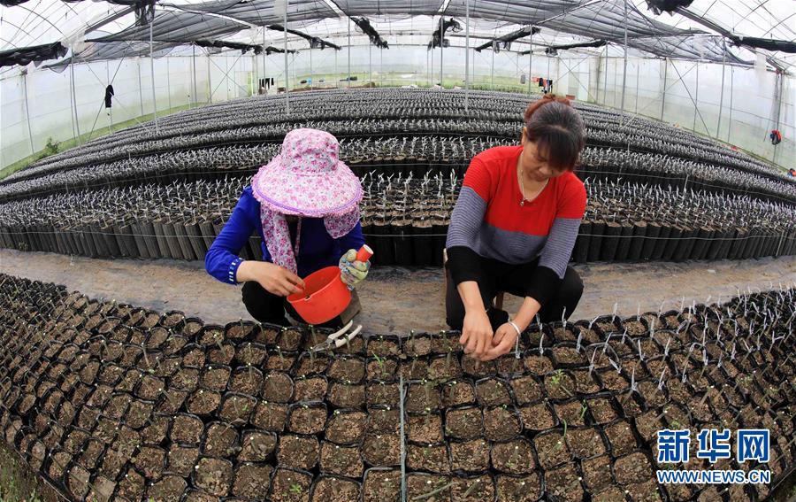 在广西融安县大良镇古兰村古兰屯大棚基地,村民在嫁接金桔苗(4月12日摄)。 新华社记者 黄孝邦 摄