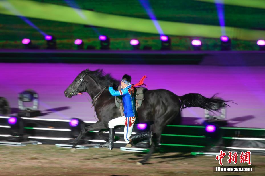 8月18日,开幕式上的马上技巧表演。当日,第二届中国马文化节暨首届内蒙古国际马文化博览会在内蒙古自治区呼和浩特市开幕。 中新社记者 刘文华 摄