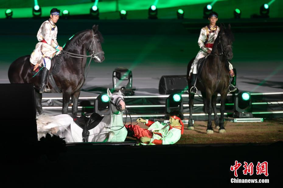 8月18日,开幕式上,一名演员在表演时不慎倒地。当日,第二届中国马文化节暨首届内蒙古国际马文化博览会在内蒙古自治区呼和浩特市开幕。 中新社记者 刘文华 摄