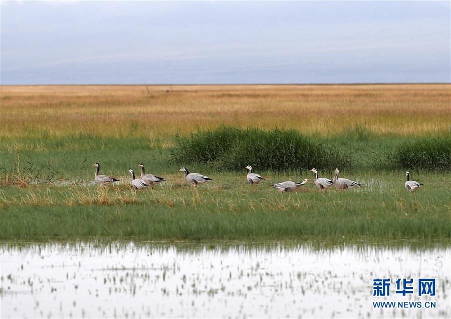 8月22日,在甘肃阿克塞海子草原,一群斑头雁在湿地休憩。 甘肃省酒泉市阿克塞哈萨克族自治县位于祁连山西部,野牦牛、野骆驼、藏原羚、盘羊、雪豹等数十种野生动物在此栖息繁衍。近年来,该县通过设立自然保护区和野生动物救护站、实施草原禁牧减畜政策、加大非法狩猎惩治力度等举措,使得境内生态环境不断改善,野生动物种群数量逐步增加。 新华社记者 马宁 摄