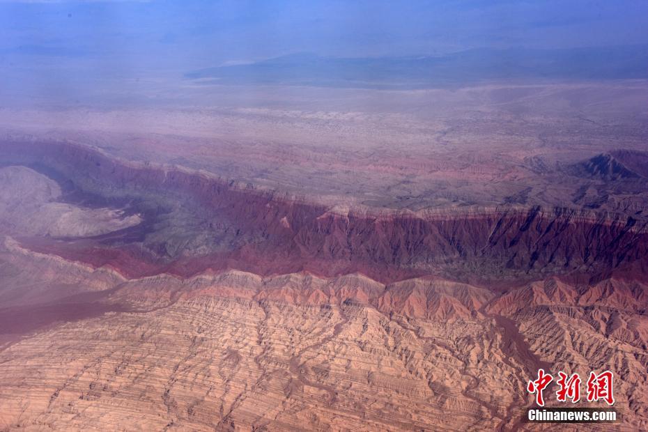 8月23日,从新疆博尔塔拉蒙古自治州博乐飞往喀什,飞越南天山西段雪山,可远眺新疆海拔最高、面积最大的高山湖泊赛里木湖风光,高空俯瞰,大漠戈壁的独特地貌雄浑壮观,切实感受和体验“不到新疆,不知中国之大”的说法。图为大漠戈壁独特地貌。 中新社记者 孙自法 摄