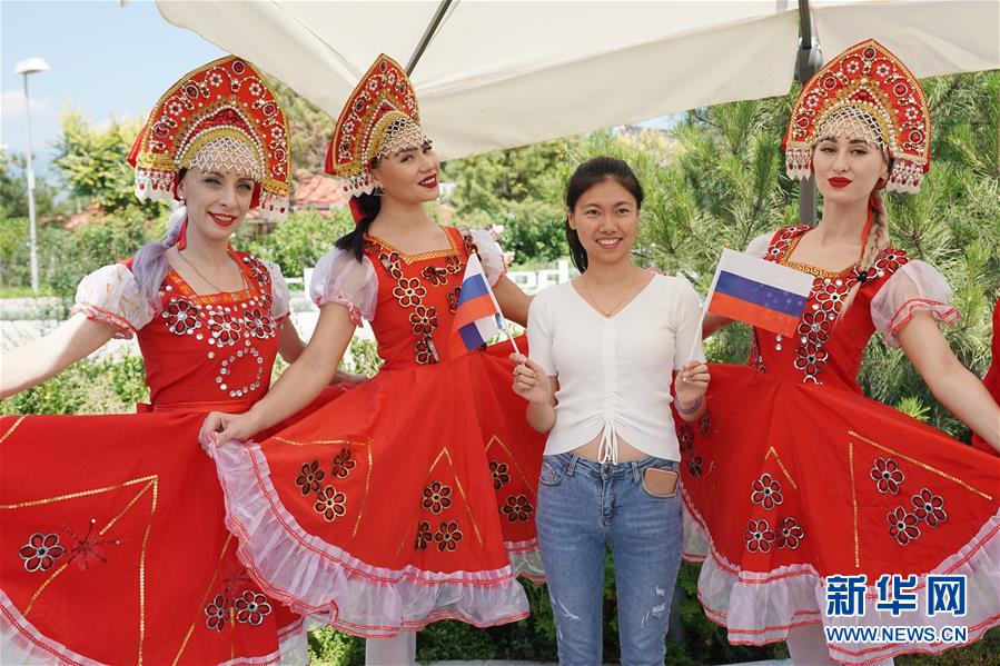 8月24日,参观者在北京世园会俄罗斯展园内与演员合影。 当日,2019年中国北京世界园艺博览会“俄罗斯国家日”活动在北京世园会园区举行。 新华社记者 鞠焕宗 摄