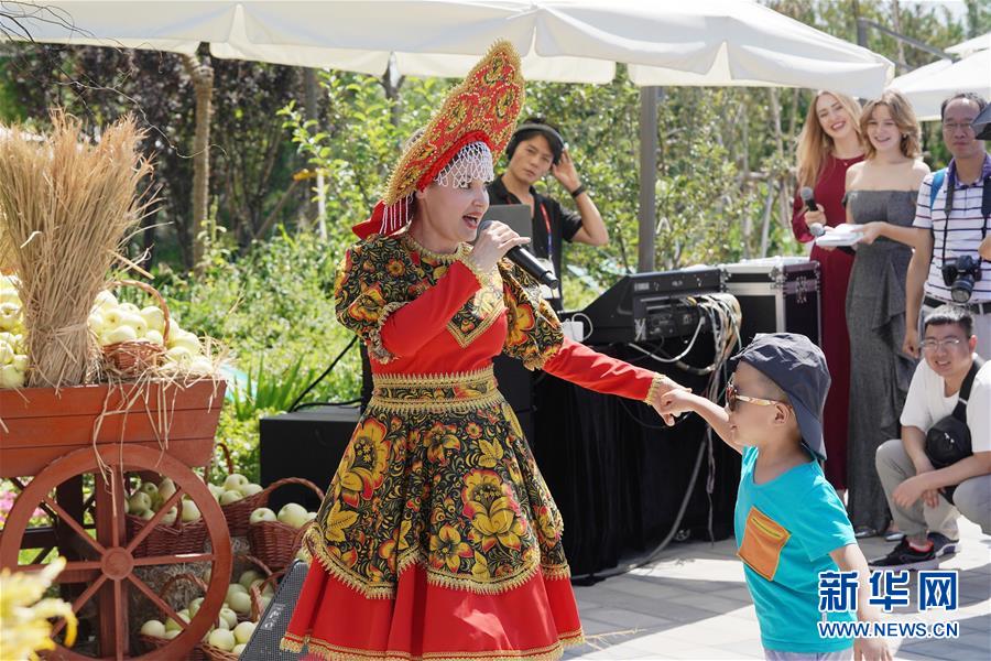 8月24日,演员在“俄罗斯国家日”活动上与小观众互动。 当日,2019年中国北京世界园艺博览会“俄罗斯国家日”活动在北京世园会园区举行。 新华社记者 鞠焕宗 摄