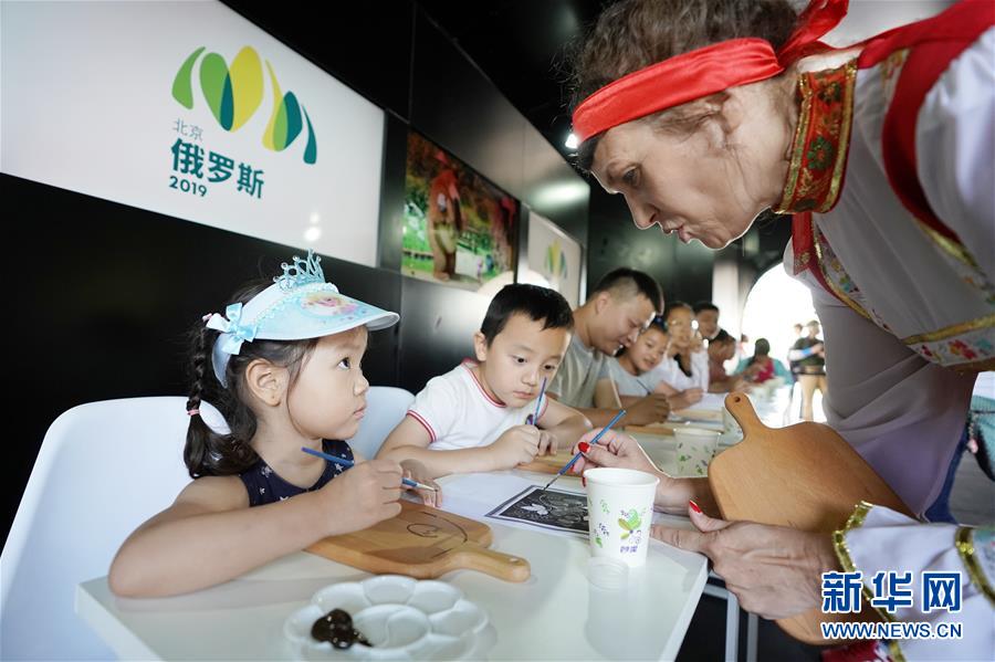 8月24日,在北京世园会俄罗斯展园内,工作人员指导小朋友体验俄罗斯绘画。 当日,2019年中国北京世界园艺博览会“俄罗斯国家日”活动在北京世园会园区举行。 新华社记者 鞠焕宗 摄