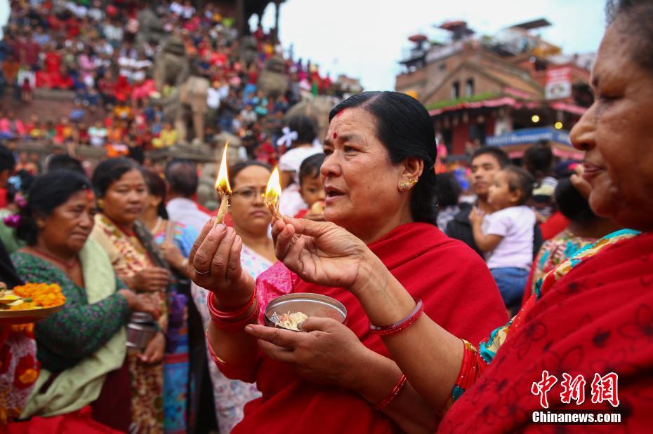 8月28日,尼泊尔古城巴德岗民众庆祝夏五礼节(Pancha Dan)。在这一天,人们要迎接佛像,佛教徒们还要向僧人赠送谷、米、盐、钱和水果5种物品。 中新社记者 普拉丹 摄
