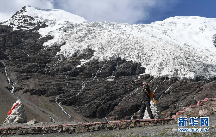 游客在卡若拉冰川脚下游览(8月31日摄)。 卡若拉冰川位于西藏山南市浪卡子县和日喀则市江孜县交界处。巨大的冰川从山顶云端一直延伸到离307省道只有几百米的地方。 新华社记者 晋美多吉 摄