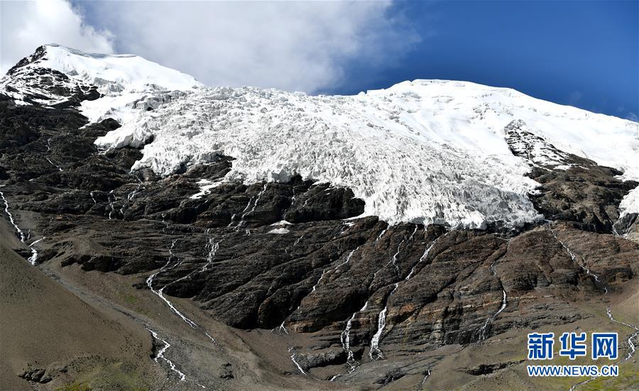 卡若拉冰川风光(8月31日摄)。 卡若拉冰川位于西藏山南市浪卡子县和日喀则市江孜县交界处。巨大的冰川从山顶云端一直延伸到离307省道只有几百米的地方。 新华社记者 李鑫 摄