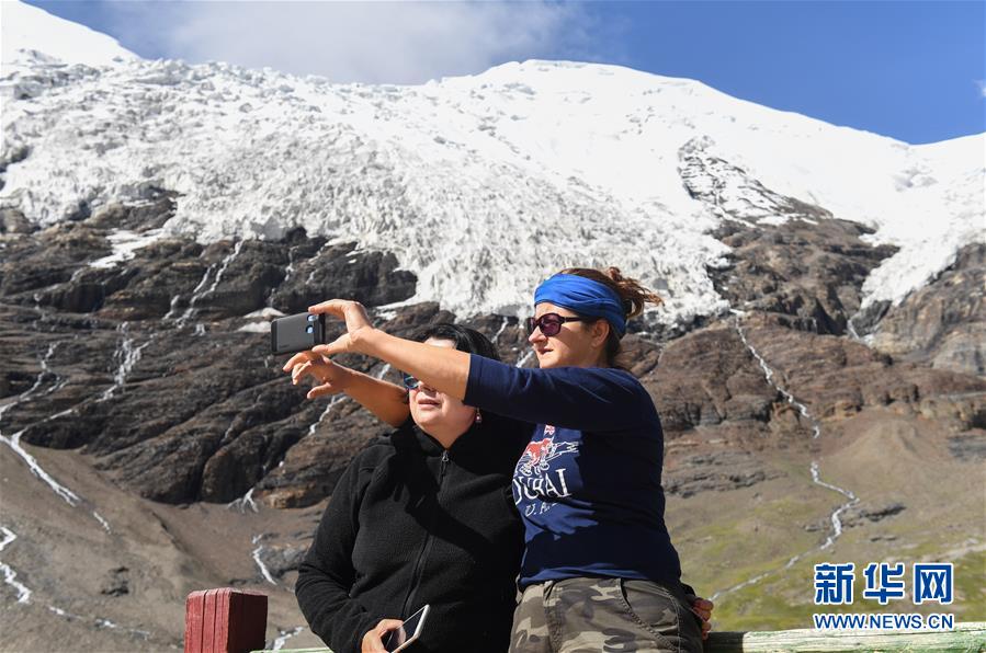 游客在卡若拉冰川脚下拍照(8月31日摄)。 卡若拉冰川位于西藏山南市浪卡子县和日喀则市江孜县交界处。巨大的冰川从山顶云端一直延伸到离307省道只有几百米的地方。 新华社记者 晋美多吉 摄