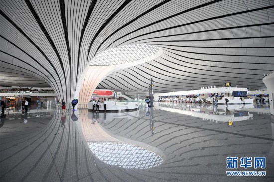 9月4日拍摄的北京大兴国际机场内部。 随着各项验收的完成,北京大兴国际机场投运在即。北京大兴国际机场是目前世界最大的综合交通枢纽,拥有全球首座高铁地下穿行的机场航站楼、全球首座双层出发双层到达的航站楼、世界最大单体航站楼。 新华社记者 张晨霖 摄