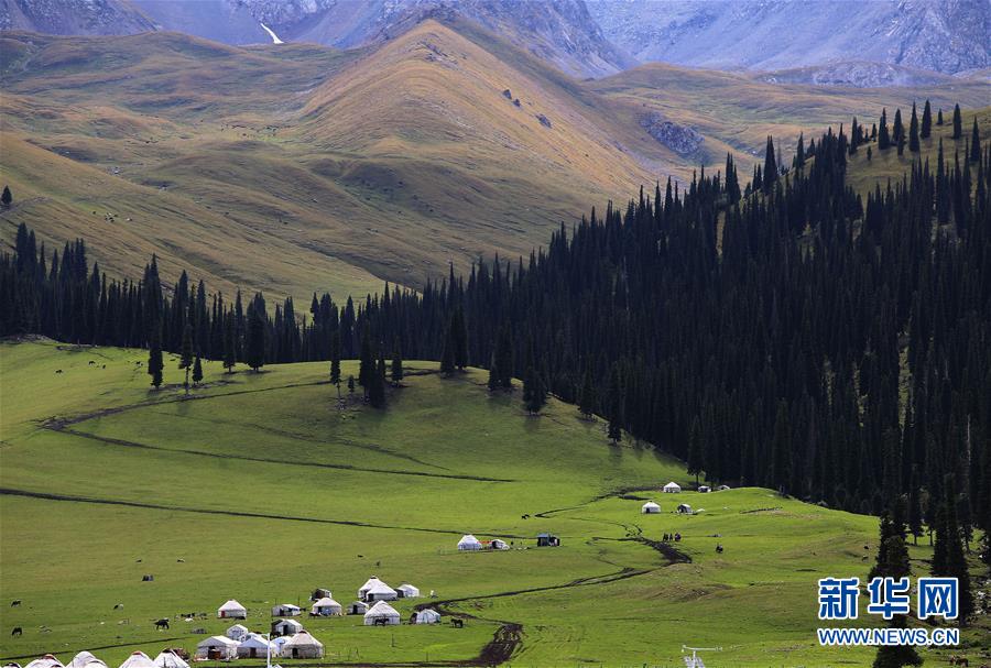 这是9月7日拍摄的那拉提景区风光。 那拉提景区位于新疆新源县境内,三面环山,巩乃斯河蜿蜒流过,保留着浓郁的民俗风情和丰富的草原文化。 新华社记者 安希雅 摄