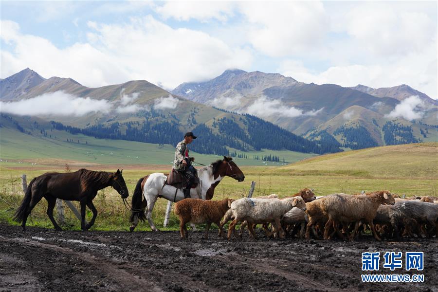 9月7日,牧民在那拉提草原放羊。 那拉提景区位于新疆新源县境内,三面环山,巩乃斯河蜿蜒流过,保留着浓郁的民俗风情和丰富的草原文化。 新华社记者 邹予 摄