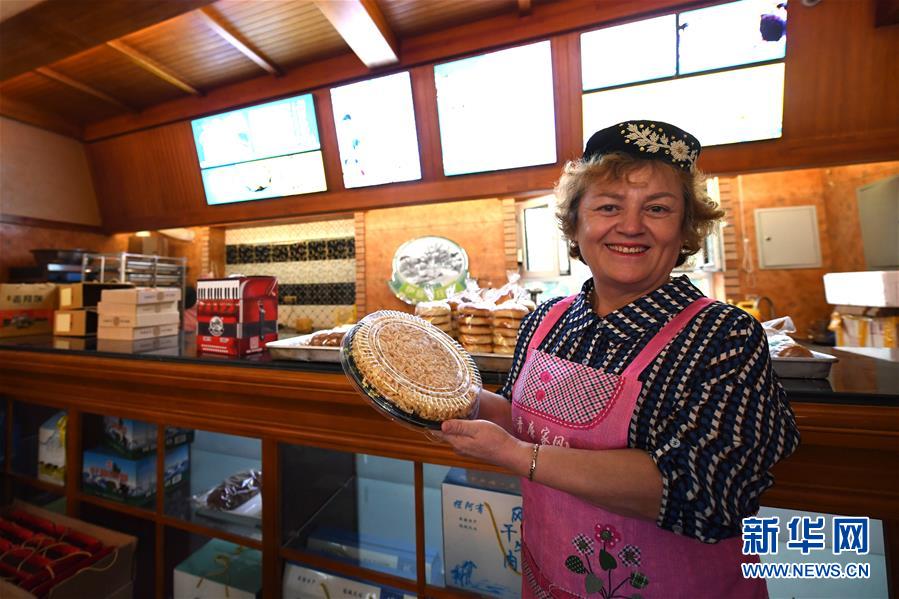 9月4日,塔塔尔族人再屯娜·卡利穆瓦在塔城自己开的店里介绍塔塔尔族美食恰克恰克(也叫沙琪玛)。再屯娜·卡利穆瓦是塔城地区塔塔尔族文化协会的会长,致力于民族传统美食的推广。