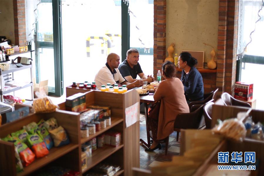9月4日,当地居民在塔城的塔塔尔族人再屯娜·卡利穆瓦的餐厅聚会。 新华社记者 程丽 摄