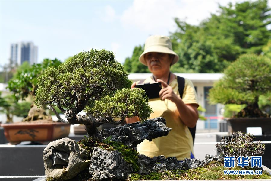 9月9日,一名参观者在台北士林园艺所观赏盆景。新华社记者 陈斌 摄