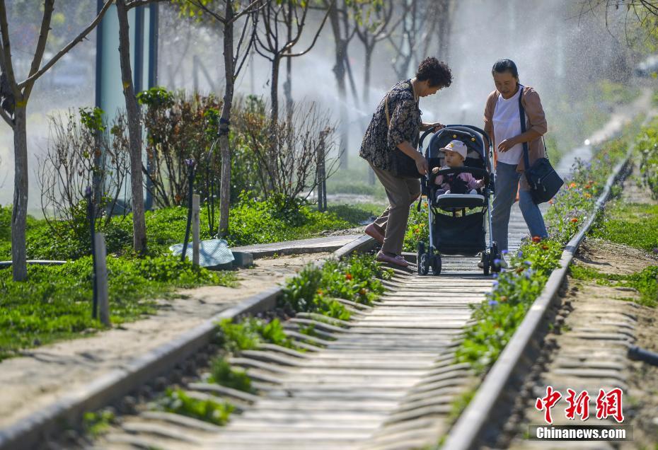 9月9日,新疆乌鲁木齐市高新区(新市区)京疆路铁路主题公园,周边居民带着孩子在此散步。这是该市首个以铁路为主题的公园,1.7公里的铁路纵贯公园,铁轨被改造成健身步道,两侧是绿地、花圃、小广场,为沿线20多个居民小区,约10万人提供公共绿地,并通过慢行系统联通周边居住用地,满足市民游憩娱乐等公共服务需求。据介绍,该公园所利用的铁路为建成于1964年的六道湾铁路,为运煤专线。2007年六道湾煤矿关闭,此段铁路废弃。中新社记者 刘新 摄