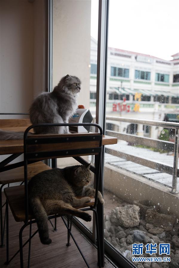 这是9月9日拍摄的曼谷动物咖啡馆的两只猫。新华社记者 张可任 摄