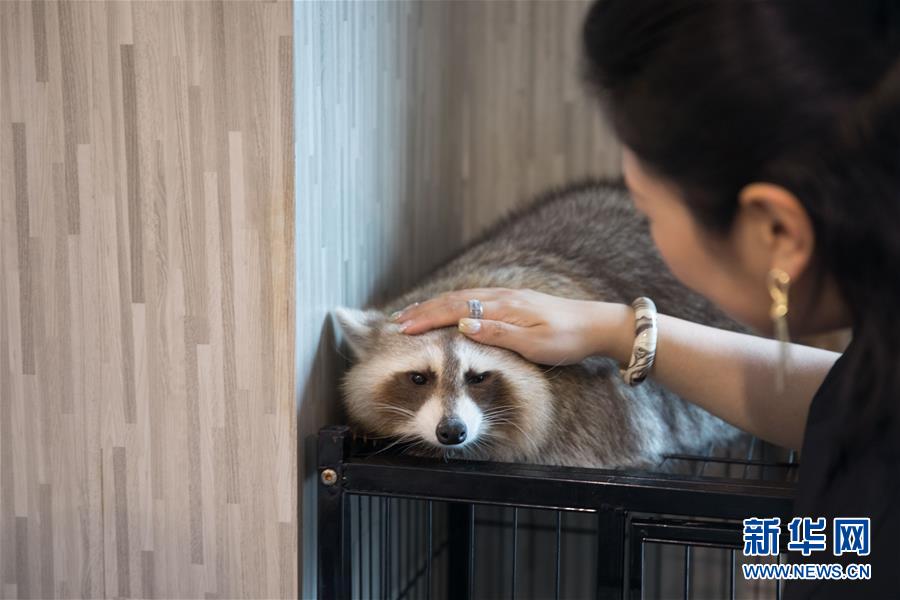 9月9日,一名顾客在曼谷动物咖啡馆和一只浣熊互动。新华社记者 张可任 摄