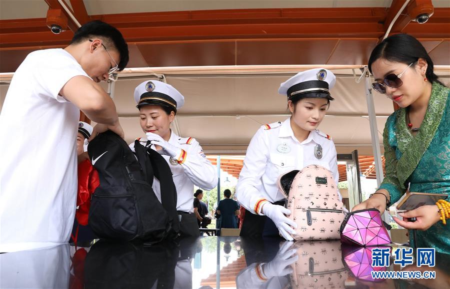 9月11日上午,上海迪士尼乐园工作人员在乐园入口处按照新规检查游客随身携带的背包。新华社记者 任珑 摄