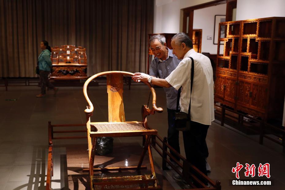 9月19日,两位老人在中国紫檀博物馆内仔细观看展出的黄花梨交椅。当日,中国紫檀博物馆举行开馆二十周年庆典,博物馆免费对外开放。中新社记者 盛佳鹏 摄