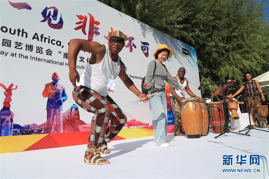 9月24日,演员在“南非文化遗产日”活动上与观众互动。 当日,北京世园会迎来“南非文化遗产日”。在草坪剧场,鲜艳的非洲服饰、热情奔放的舞蹈,在世园会掀起非洲热浪,吸引了大量游客观赏。 新华社发(段学峰 摄)