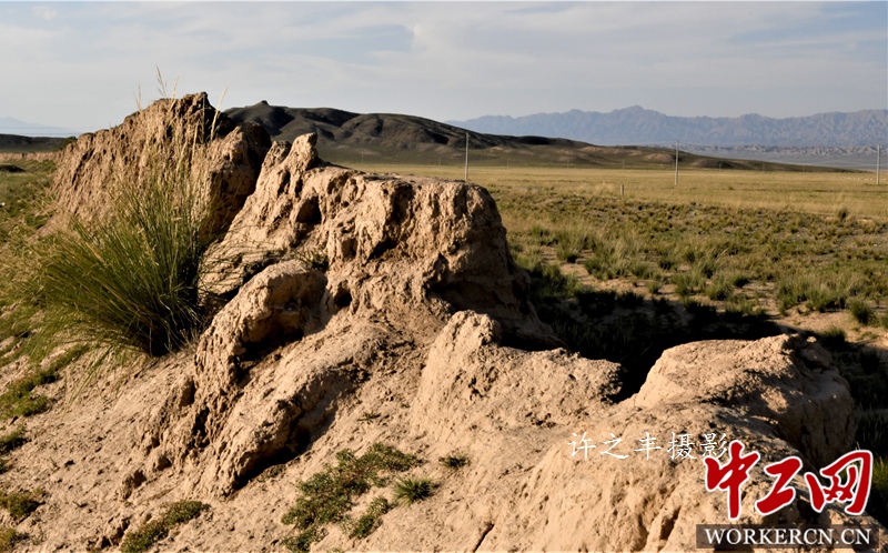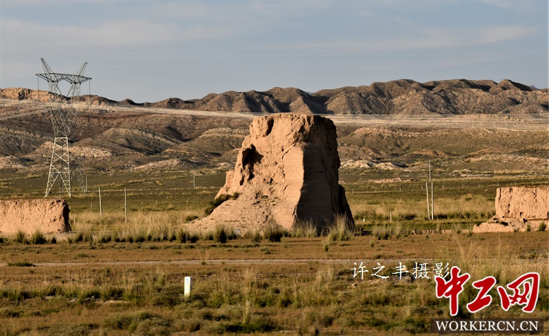 2019年9月25日,作者沿着明长城西行,走进丰城和峡口段。这里是古代中原通往西域的交通要道,也是古丝绸之路的重要驿站。从汉代开始,在此屯兵设防,明清两代扩大防守,扼甘凉咽喉,锁金川大地,军事地理位置十分重要。图为保存完好的汉、明长城遗址,雄伟壮观,宛若一条蜿蜒蠕动的巨龙。工人日报-中工网许之丰摄影报道