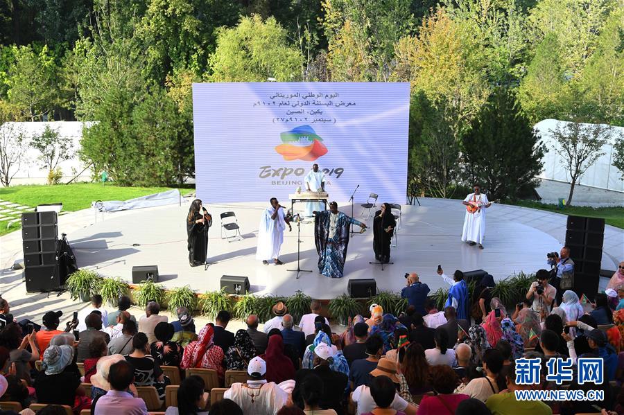 9月27日,演员在“毛里塔尼亚国家日”活动中表演。 当日,2019年中国北京世界园艺博览会“毛里塔尼亚国家日”活动在北京世园会园区举行。 新华社发(任超摄)