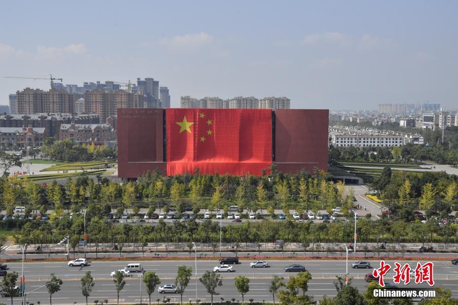 9月29日,昆明,悬挂在云南省博物馆外的国旗。国庆节到来之际,一面长52米、宽34.67米,总面积达1802.84平方米的国旗日前亮相云南省博物馆,几乎覆盖了一整面外墙,吸引众多市民到此合影。中新社记者 刘冉阳 摄