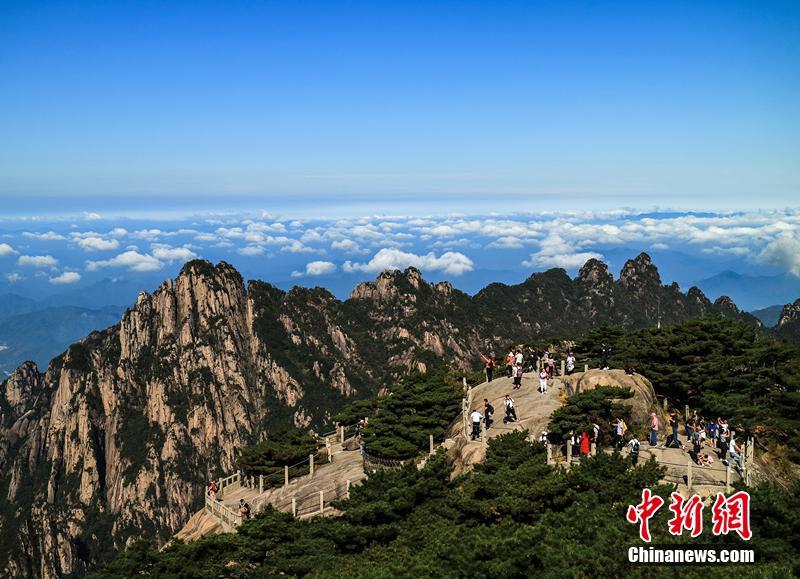 10月2日,安徽黄山风景区风和日丽,清晨黄山出现大面积云海景观,云雾翻涌,气势壮观。秋日的黄山层林尽染,灿若图绣,吸引许多游客观赏。文/刘浩 黄山风景区供图