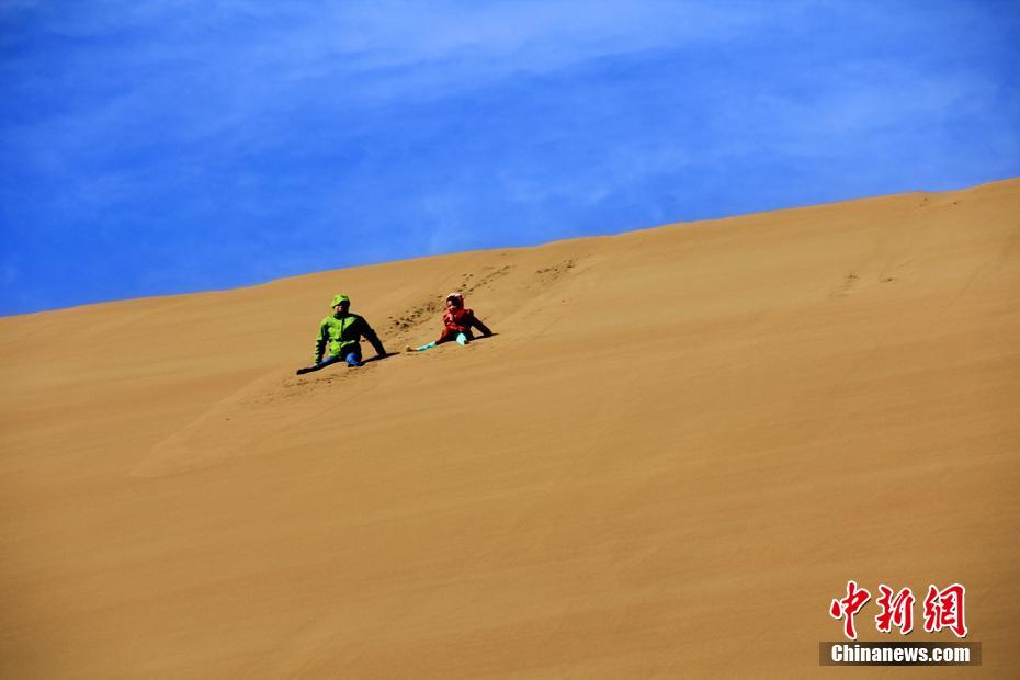 10月3日,游客在木垒县鸣沙山体验滑沙的乐趣。史玉江 摄