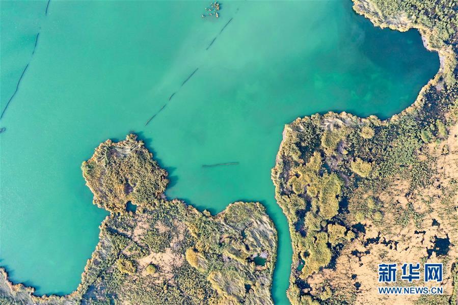 这是新疆博斯腾湖湿地一景(10月12日无人机拍摄)。 入秋以来,新疆博斯腾湖碧波荡漾,美景如画,吸引各地游客前来游玩。 新华社记者 丁磊 摄
