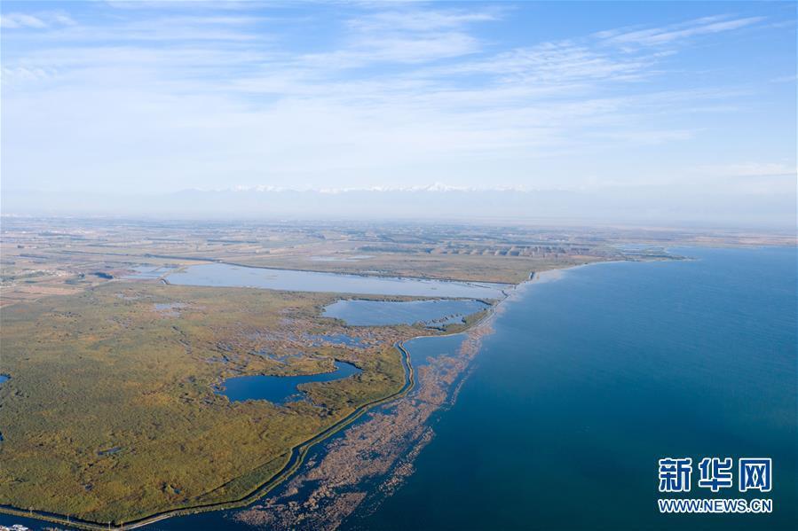这是新疆博斯腾湖美景(10月12日无人机拍摄)。 入秋以来,新疆博斯腾湖碧波荡漾,美景如画,吸引各地游客前来游玩。 新华社记者 丁磊 摄