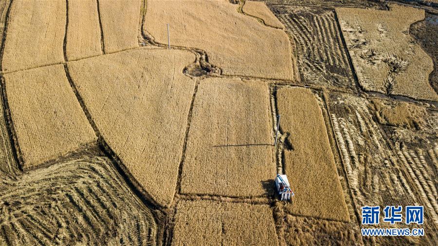 10月15日,在吉林省长春市朝阳区乐山镇莲花村,农民驾驶农机收割水稻(无人机拍摄)。 金秋十月,在吉林省农村的田间地头,众多农民正在抓紧时间收割作物,“绘”出一幅幅美丽的秋收图景。 新华社记者 张楠 摄