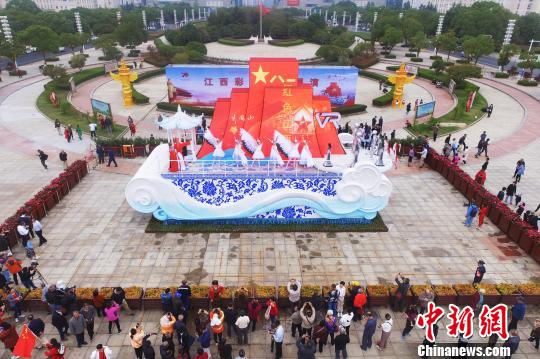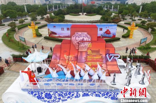 10月15日,“金色赣鄱”江西彩车亮相南昌市红谷滩新区行政广场,并进行了首场汇报展演,吸引了众多市民和游客围观、拍照。彩车底部的如意造型,点缀景德镇的青花吉祥纹样和青花瓷地毯,布置汤显祖的《牡丹亭》戏曲表演,在井冈山造型的超大立体异形LED显示屏上,通过LED大屏幕循环播放红色、古色、绿色、金色江西的视频内容,与车上人物造型表演、机器人表演、VR标识造型相得益彰,展示了江西传承红色基因、厚植古色文化、加快绿色崛起、汇聚金色发展的勃勃生机。