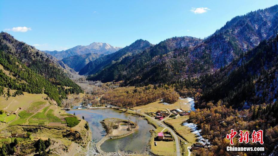 10月17日,位于青海省互助土族自治县的互助北山国家森林地质公园秋意盎然。图为航拍互助北山国家森林地质公园景色一角。中新社记者 马铭言 摄