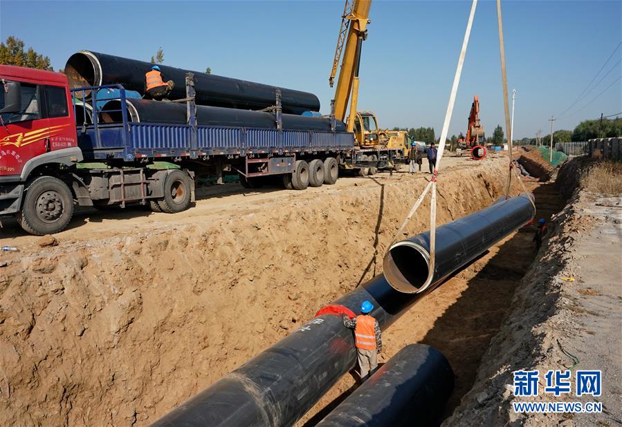 10月21日,工人在秦皇岛市京能热电与抚宁供热系统互联项目输入管道铺设工地施工。
