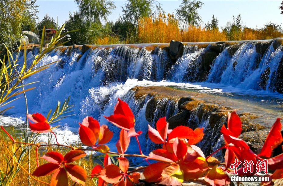瀑布在秋色的映衬下更加迷人。张掖芦水湾生态景区,占地面积约4500亩,其中水域面积2260亩,蓄水量265万立方米。王将 摄