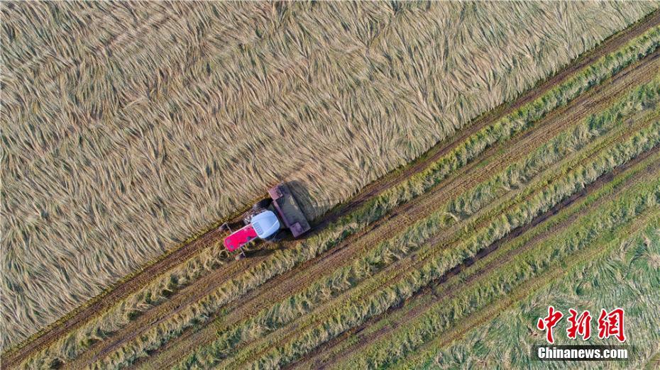 航拍收割“铃铛麦”。王超 摄