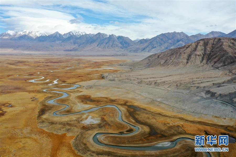 新疆帕米尔高原上一处草场(10月21日无人机拍摄)。 深秋时节,新疆帕米尔高原雪山连绵起伏,湖水波光潋滟,在蓝天白云的映衬下呈现出一幅幅美丽的画卷。 新华社记者 丁磊 摄
