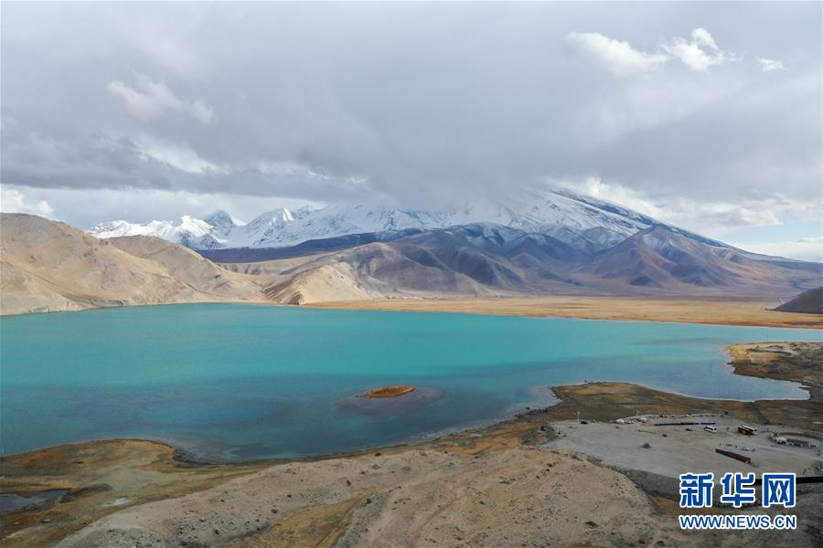 新疆阿克陶县喀拉库勒湖(10月19日无人机拍摄)。 深秋时节,新疆帕米尔高原雪山连绵起伏,湖水波光潋滟,在蓝天白云的映衬下呈现出一幅幅美丽的画卷。 新华社记者 丁磊 摄