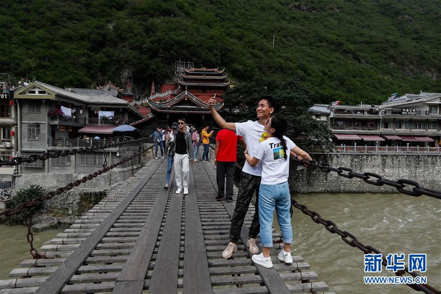 一对情侣在泸定桥上留影(6月27日摄)。 金秋十月,中国最美景观大道——川藏线上,中外游客络绎不绝。途经雅康高速上身披“红妆”的泸定大渡河大桥,人们无不为其雄壮所震撼。环其周围,泸定大渡河上还有泸定桥、泸定大渡河吊桥等大桥巍然伫立,数桥并跨交相辉映,见证了中国桥梁建设的光荣与梦想。 新华社记者 江宏景 摄