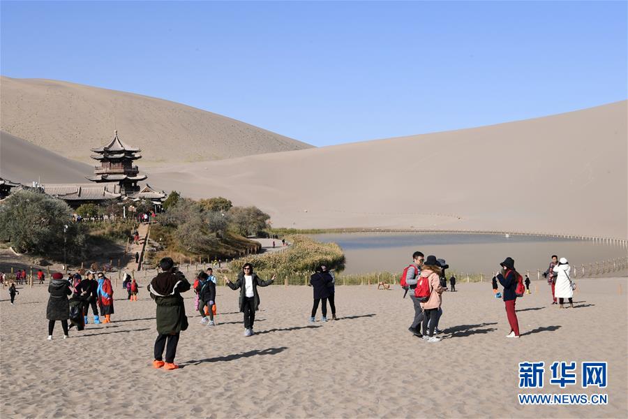 10月25日,游客在敦煌鸣沙山月牙泉景区参观游览。
