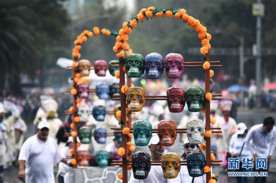 这是11月2日在墨西哥首都墨西哥城亡灵节游行上拍摄的面具。新华社记者 辛悦卫 摄