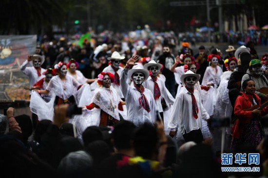 11月2日,在墨西哥首都墨西哥城,人们参加亡灵节游行。新华社记者 辛悦卫 摄