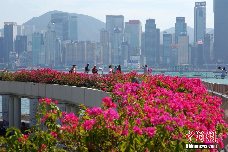 11月4日,香港迎来又一个秋高气爽的艳阳天,位于香港文化中心广场观景台的三角梅在阳光下绽放,为维港美景平添一道亮丽风景线。中新社记者 张炜 摄