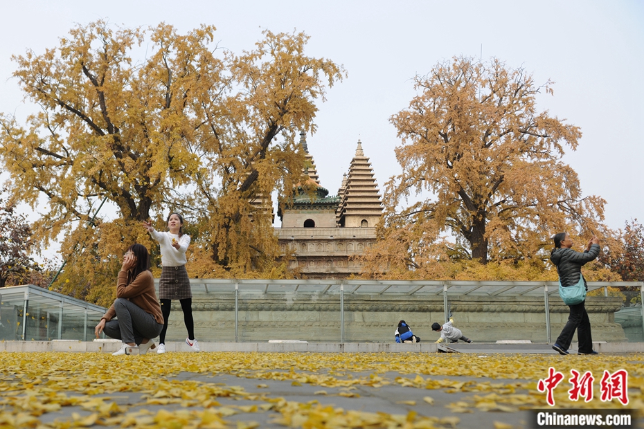 北京的观赏银杏的地方有很多,各大寺庙更是赏秋人的必去之地。寺庙与银杏之间总有着奇特的契合度,佛塔古刹旁,伫着几棵几百上千年的银杏树,既有灵气,又透出古朴的历史感。图为游人在真觉寺两棵树龄超过600年的银杏树前拍照。中新网记者 李骏 摄